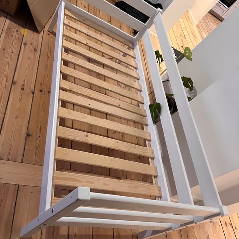 Enkelseng til børn i hvidt design. Sengen har sengehest i siderne, som giver ekstra sikkerhed til mindre børn og har erstattet vores tremmesenge. Rammen er i træ med hvid overflade. Der ses enkelte mærker og brugsspor på sengerammen. Egnet som juniorseng eller enkeltseng til børneværelset. Man kan selv vælge hvilken ved åbningen skal vende.