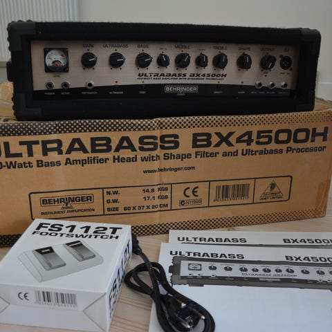 Kraftigt bas-setup bestående af Behringer Ultrabass BX3000T top og Hartke VX Series 4x10 kabinet (400W). Der er almindelige brugsspor som ses på billederne, men intet der påvirker funktionen.