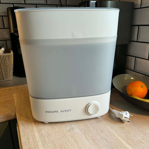 Philips Avent Advanced flaskesterilisator til sterilisering af babyflasker og tilbehør. Enheden er elektrisk og er designet til at sterilisere flere flasker og sutter ad gangen. Sterilisatoren har aftagelige indsatser, så indretningen kan tilpasses forskellige typer flasker og små dele. Produktet leveres med brugervejledning og er egnet til brug i hjemmet til daglig rengøring og hygiejnisk opbevaring af babyudstyr. Købt direkte hos Philips. (Nypris hos forhandler 699 kr.)
