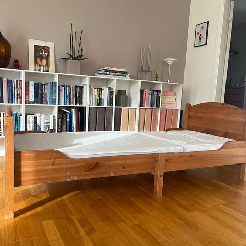 IKEA juniorseng i hvid med integreret udtræksseng og opbevaring. Sengen har lamelbund og to skuffer under nederste del, som kan bruges til opbevaring af sengetøj eller legetøj. Øverste sengemål er ca. 96 x 206 cm, udtræksseng ca. 90 x 189 cm. Konstruktionen er i træ/komposit med lakeret overflade. Det er medfølger en madras af typen ÅFJÄLL (kun 1) som passer til sengen. Sengen er egnet til børn i junioralderen.