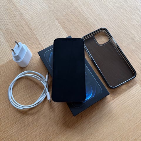 Apple iPhone 12 Pro smartphone med 128 GB intern hukommelse. Modellen har skærm med Face ID, tredobbelt bagkamera og frontkamera i skærmens øverste kant. Enheden understøtter trådløs opladning og opladning via Lightning-stik. Velegnet til almindelig brug, foto, video og apps med behov for god lagerplads.