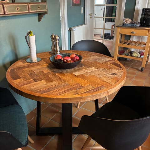 Rundt sildebens-spisebord i mørk eg med sorte krydsben fra STRUM (håndlavet). Det står som nyt, da det har haft bordbeskyttelse på. Dette medfølger, hvis ønskes. Derudover får man vedligeholdelse til bordpladen med. Ben og bordplade kan skilles ad.