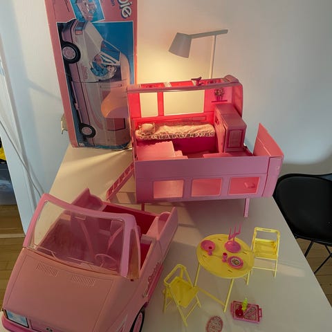 Barbie campingvogn legetøjsbil i pink plast. Vognen kan åbnes ud til siden, så der dannes et indvendigt legeområde med flere rum. Indvendigt er der blandt andet køkkenområde med komfur og vask, siddepladser, bord og trappe. Foran er der førersæder og rat under den gennemsigtige forrude. Egnet til leg med Barbie-dukker og lignende modedukker i tilsvarende størrelse. Hentes i Hvidovre.