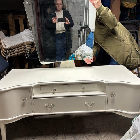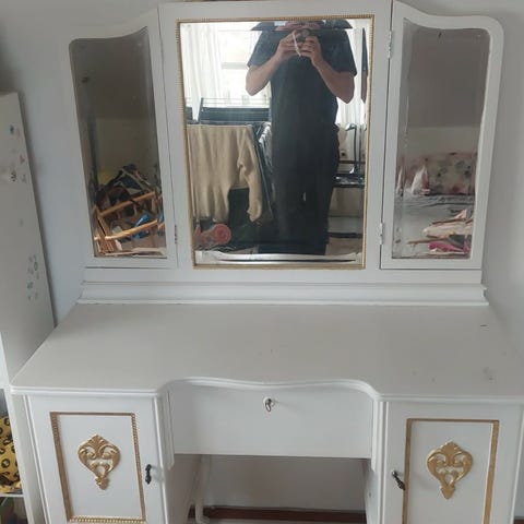 Flot sminkebord sælges grundet flytning Det har de originale facetslebne spejle. Mål er 120 cm lang. 160 cm høj. 48 cm dyb.