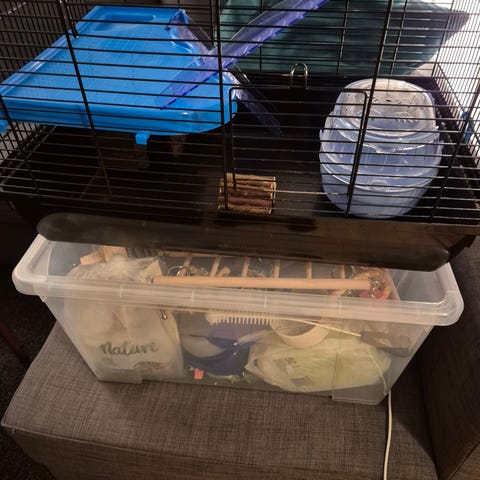 Bur og diverse tilbehør til dværghamster sælges. Herunder transportbur og løbegård. Af yderligere udstyr medfølger drikkeflaske, madskål, skål til sandbad, diverse hjul, diverse legeting, strøelse til bur mm. Sælges samlet.