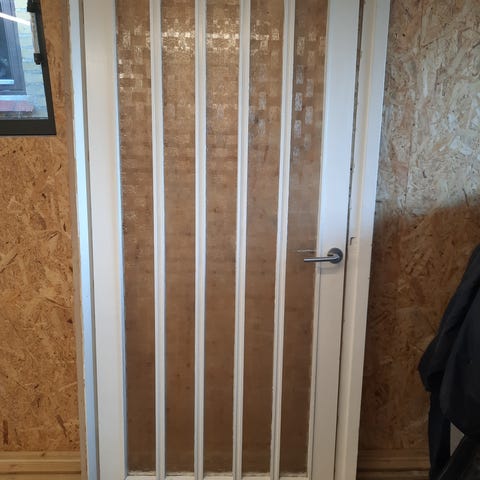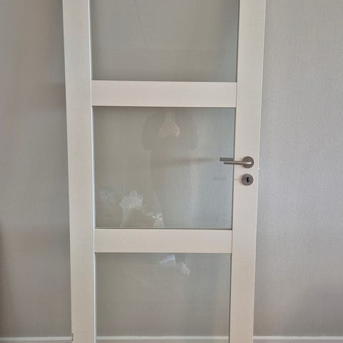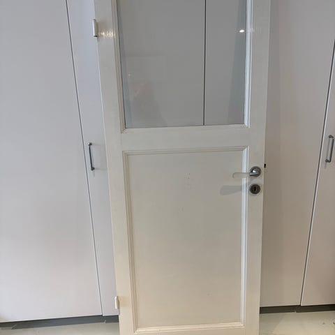 Indvendig glasdør i hvidmalet træ med tre glasfelter. Døren har udskæringer til dørgreb og lås. Velegnet som rumadskillelse i bolig, hvor der ønskes lysgennemgang mellem rummene.