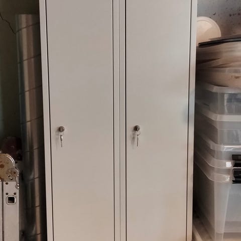 Metal dobbelskab med to separate nøgler, 190 cm højt, 70 cm bredt, 50 cm dybt, lidt gennemrustet i bunden på den ene side