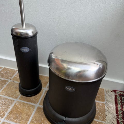Vipp toiletsæt bestående af pedalspand og toiletbørste. Pedalspanden er i cremefarvet metal med låg og detaljer i rustfrit stål samt fodpedal. Toiletbørsten er i hvidt metal med skaft og top i rustfrit stål. Sættet er velegnet til badeværelse eller toilet, hvor der ønskes matchende affaldsspand og toiletbørste i samme designserie.