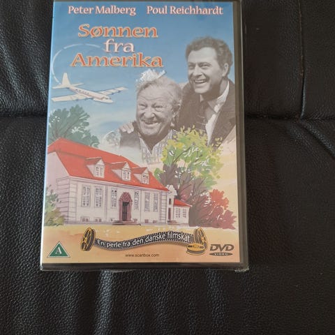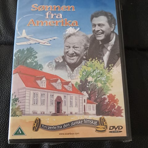 Sønnen fra Amerika dvd film. Dansk spillefilm udgivet på dvd. Forsiden viser skuespillerne Peter Malberg og Poul Reichhardt samt et husmotiv og et fly. Egnet til afspilning på dvd-afspillere, der understøtter standard dvd-format.