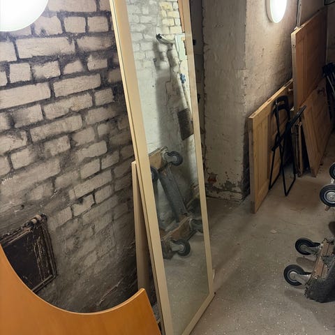 Stort spejlglas som er limet fast på en gipsplade. Spejlet er i fin stand i kanterne, men gipspladen er flosset i kanterne. Størrelsen på spejlet er 204 cm x 81 cm (gipsplade er ca 8 cm længere end spejlet).