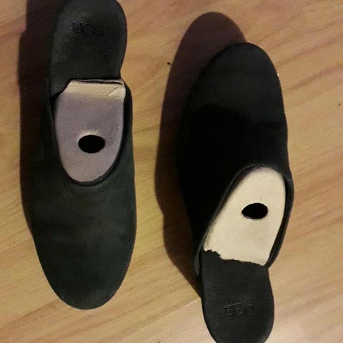 UGG træsko og mules i størrelse 40. Modellen har lukket tå og hælrem med velcrolukning. Skoene er fremstillet i grå/grønlig ruskind med lys sål. Velegnet som hverdagssko eller hjemmesko. Brugt meget få gange