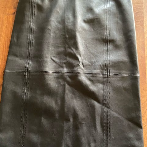 Norma modell nederdel i læder i str. 38. Nederdelen er grå og fremstillet i glat læder med længde til under knæet. Den har lommer foran, slids bagpå samt bæltestropper i linningen. Indvendigt er nederdelen foret for øget komfort. Velegnet som klassisk lædernederdel til hverdags- og kontorbrug.