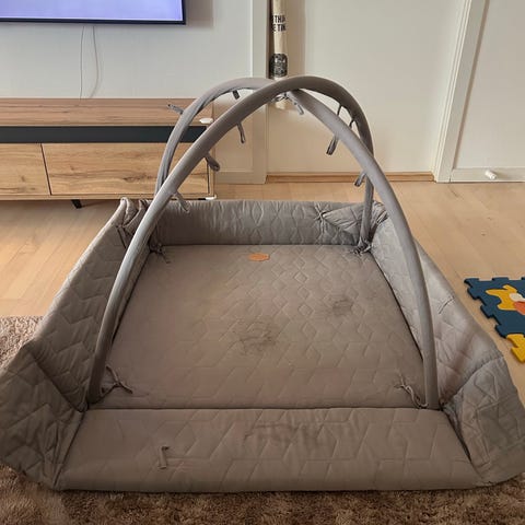 Babynest legetæppe i grå farve. Blød, polstret bund med hævede kanter, der kan foldes op og ned. To buer over midten, hvor der kan hænges legetøj. Leveres med opbevaringspose med lynlås. Velegnet som legeområde til baby på gulvet.
