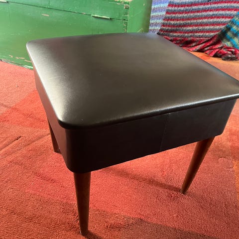 Fin syskammel i retro stil. Der er brugsspor på betrækket , et lille hul og lidt hvidt på kanten. Men stadig pæn.
