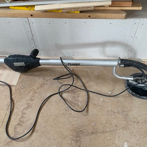 Tecnic girafsliber i blå farve. El-drevet slibemaskine med langt teleskopskaft og rundt slibehoved, egnet til slibning af vægge og lofter. Maskinen har håndtag med betjeningsknapper og er udstyret med fleksibel slange til tilslutning af støvsuger for støvudsugning. Rund slibeskive monteret i bunden af slibehovedet. Velegnet til indendørs overfladebehandling som spartel- og gipsvægge.