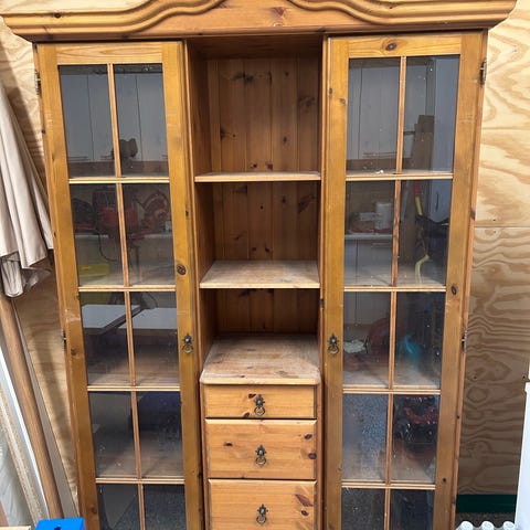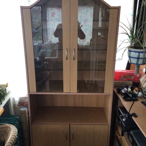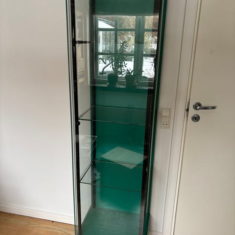 Vitrineskab fra Ilva med 2 glashylder i øverste del og en træhylde i underskabet.