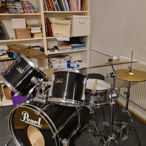Komplet trommesæt i sort. Klassisk sæt i god kvalitet. Sættet består af stortromme, lilletromme, flere tammer og gulvtam. Der medfølger bækkener monteret på stativer samt hi-hat og kvalitets stortrommepedal. Alle trommer, bækkener, hardware og stol medfølger. Rigtig meget for pengene - sælges grundet ny interesse.