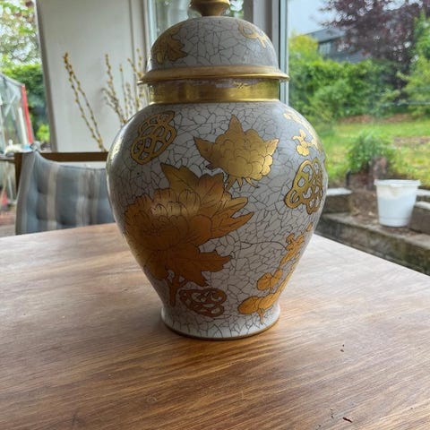 Elegant krukke m. næsten intakt fin guld-decor. Antageligt chinoise inspireret motiv fra ca. 1950'erne