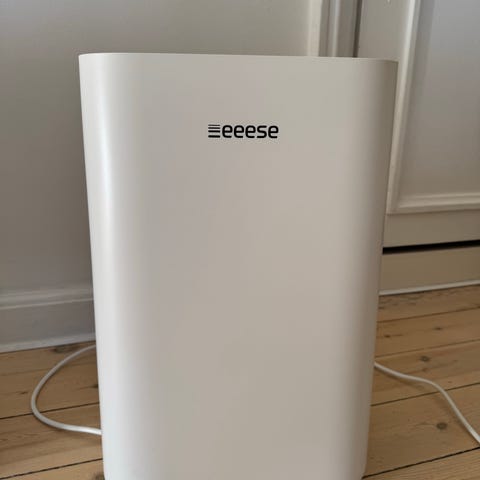 Eeese affugter i hvid. Enheden har betjeningspanel på toppen med display og knapper til styring af funktioner. Luftindtag og udblæsning er placeret på bagsiden og toppen. Egnet til indendørs brug til regulering af luftfugtighed i rum som f.eks. stue, soveværelse eller kælder.