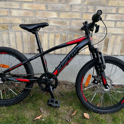 Busetto 1 mountainbike med 20 tommers hjul, sort og rød farve, stel i stål. Cyklen har forgaffel med affjedring, skivebremser foran, støtteben og pedaler med reflekser. Designet til unisex brug.