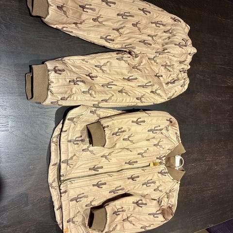 Lil'Atelier sæt overtøj unisex str. 104 i beige. Sættet består af jakke og bukser med gennemgående kaktus-print. Jakken har lynlås foran og ribkant ved hals og ærmer. Bukserne har elastik i taljen for god pasform. Overtøjet er let vatteret og egnet som overgangstøj til børn i størrelse 104. Farven er beige med mørkere print og ensfarvet brun inderside.