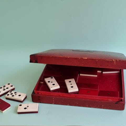 Antikt domino-spil med håndlavede brikker i træ og tilhørende æske.