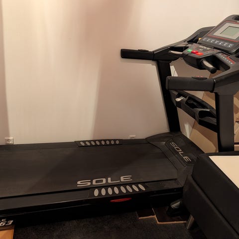 Sole F85 løbebånd i sort. Modellen har elektronisk betjening med display og knapper til hastighed og stigning. Løbebåndet er sammenklappeligt for lettere opbevaring og har håndtag ved siden af konsollen. Velegnet til indendørs løbe- og gangtræning i hjemmet.