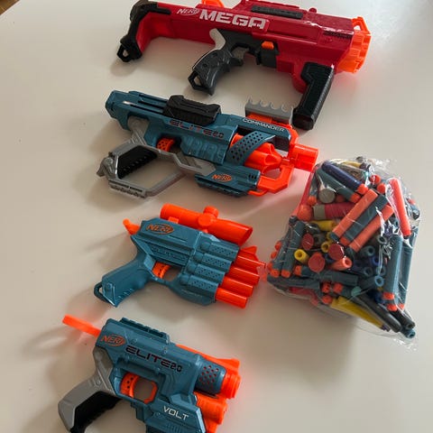 Nerf legetøjsblaster sæt med skumdart pistoler. Sættet omfatter flere blastere i forskellige farver, herunder en blå og orange model samt blastere vist på æskerne. Blasterne er beregnet til skumdart-leg og kan bruges både inde og ude. Velegnet til børn, der ønsker legetøjsvåben til dartkampe og rolleleg. Brug altid medfølgende skumdartpile eller kompatible skumpile og følg anbefalet aldersmærkning på æskerne.