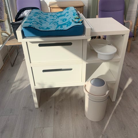 BabyDan væghængt puslebord i hvid. Puslebordet monteres på væggen og kan klappes op, når det ikke er i brug, så det fylder minimalt i rummet. Indvendigt er der pusleflade med blød puslepude fra BabyDan som medfølger, men kan tilføjes anden pude hvis man selv ønsker. Velegnet til pusleplads på badeværelse eller i børneværelse, hvor der ønskes en pladsbesparende løsning. OBS på knop håndtag mangler, men kan nemt åbne og lukkes.