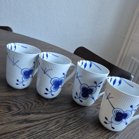 Royal Copenhagen Blå Mega Riflet krus i hvidt porcelæn med blå dekoration. Krusene har hank og riflet struktur. Velegnet til varme drikke som kaffe, te eller kakao. Klassisk stel fra Royal Copenhagen, som kan kombineres med øvrige dele i Blå Mega Riflet-serien.