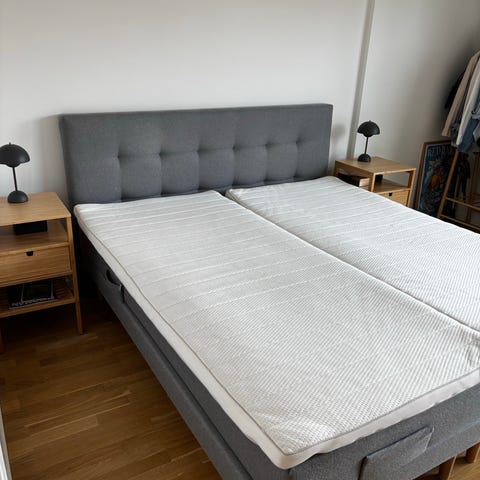 Dælls bolighus elevationsseng i størrelsen 180x200 cm. Sengen består af to separate elevationsbunde med fælles hovedgavl. Betrækket er i gråt møbelstof. Elevationen styres med kablede fjernbetjeninger monteret i siden af sengen. Velegnet som dobbeltseng med individuel justering af liggeposition på hver side.