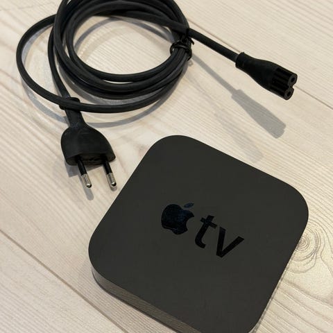 Apple TV med medfølgende fjernbetjening. Enheden fungerer som medieafspiller til tv og kan tilsluttes via HDMI. Strømkabel og HDMI-kabel fremgår af billederne. Velegnet til streaming af video og lyd fra kompatible tjenester og Apple-enheder. Sort kabinet med aluminiumsfjernbetjening, original æske medfølger ifølge billederne.