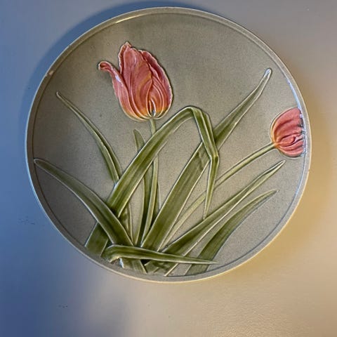 Fajance platte med grøn relief dekoration på fane