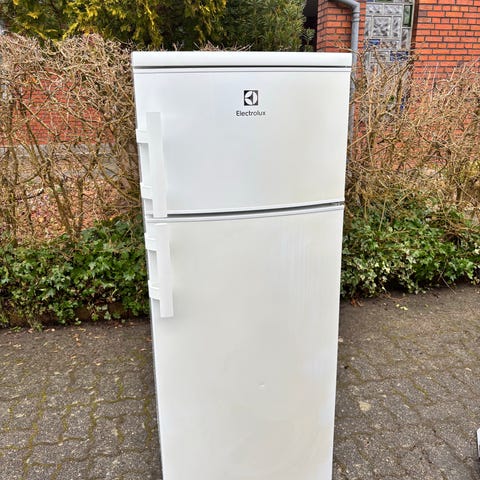 Electrolux køle-fryseskab i hvid. Skabet har kølerum med hylder og grøntsagsskuffe samt fryserum øverst med hylde. Døren har flere rum til opbevaring af flasker og mindre varer.