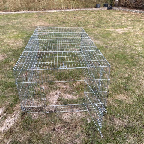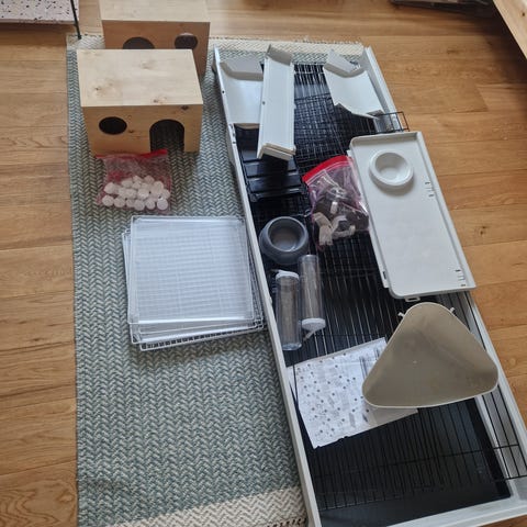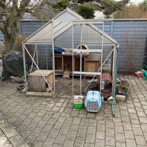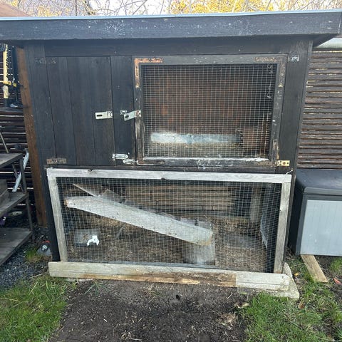 Træ kaninbur med tilhørende udendørs løbegård. Buret er i to etager med trådfronter og lille side-/frontdør samt fast tag med tagpap. Løbegården er i træ med trådnet på sider og top, delvist overdækket med plasttag. Egnet til udendørs hold af mindre kæledyr som kaniner eller marsvin, hvor dyrene kan opholde sig både i husdelen og i den åbne løbegård.