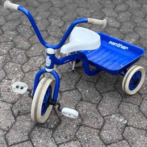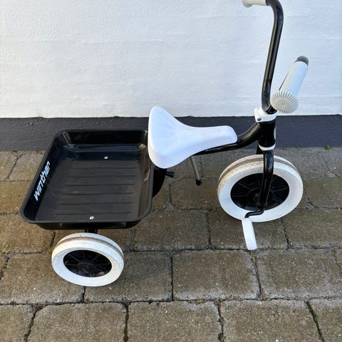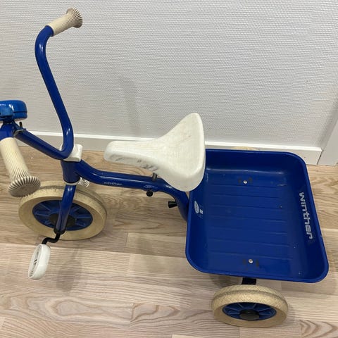Winther trehjulet cykel med 10" hjul. Cyklen har stel i rød, blå og grøn med hvidt sæde og hvide pedaler. Bagpå er der en rød ladkasse til transport af legetøj eller andre småting. Egnet som løbe- og trædecykel til mindre børn afhængigt af højde og motorik. Cyklen er udstyret med tre solide hjul for stabilitet.