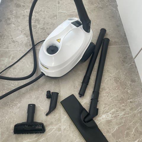 Kärcher damprenser håndholdt i gul plast. Enheden er beregnet til rengøring af mindre overflader i hjemmet ved hjælp af damp. På billedet ses tilbehør som målebæger, forskellige mundstykker og en klud, der kan anvendes til forskellige rengøringsopgaver som fx fuger, armaturer og hårde overflader. Damprenseren er egnet til almindelig husholdningsbrug.