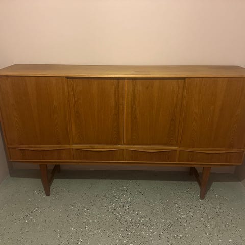 Flot skænk udført i teak finer. 2 låger med gennemgående hylde samt 2 skuffer. Den har nogen små rep. øverst se billede.
