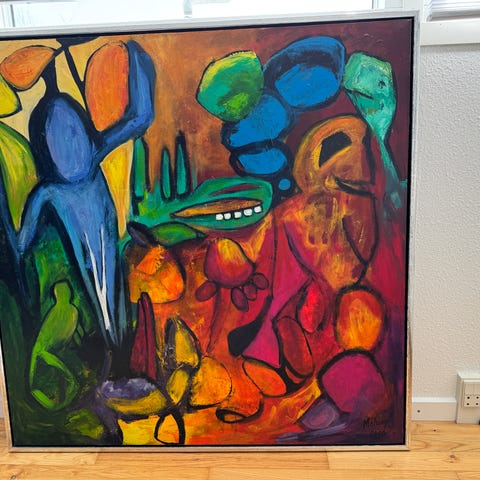 Flot abstrakt maleri i sort, hvid og okker/guld nuancer.
