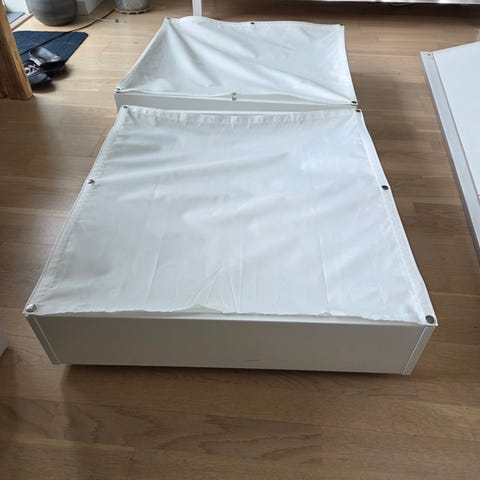 Hoppekids sengeskuffe i hvid til opbevaring under børneseng. Skuffen er rektangulær med udskåret greb på fronten og små hjul i bunden, så den kan trækkes ind og ud under sengen. Mål ca. 45 x 60 cm. Velegnet til opbevaring af legetøj, sengetøj eller tøj under passende Hoppekids senge.