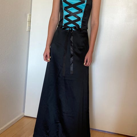 Flot og festlig blå festkjole med eller uden stropper og asymmetrisk snit.