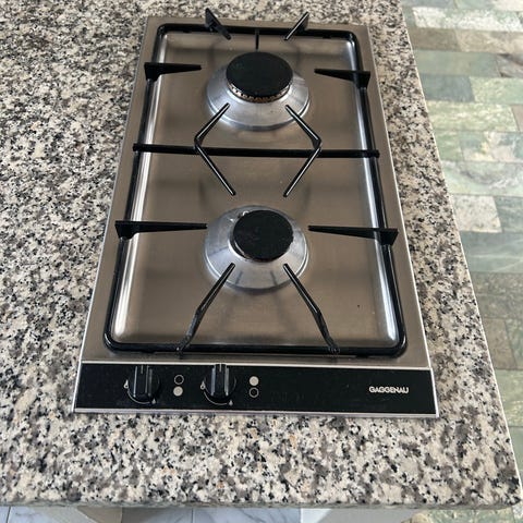 Både Gaggenau gasblus og Gaggenau kogeplade er også til salg. Det samme er marmorbordpladen med udskæringer.