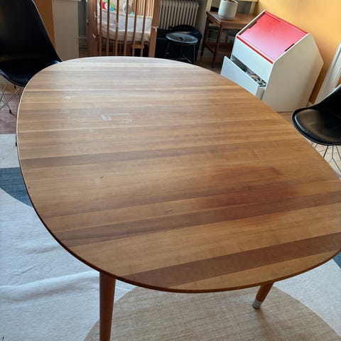 Spisebordet er i pænt stand med brugsspor i pladen som ses på billede. Bordet er i samme stil som piet hein med stålben. Udtræksplader er i samme træfarver som bordpladen,