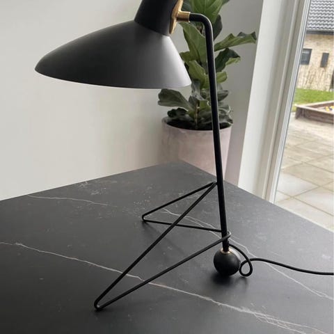 Det minimalistiske design og den sorte finish gør lampen nem at integrere i både moderne og klassiske indretninger. Kombinationen af det skulpturelle stel og den enkle skærm giver Tripod-lampen et ikonisk udtryk, der fortsat fremstår relevant og stilfuldt i nutidige interiører.