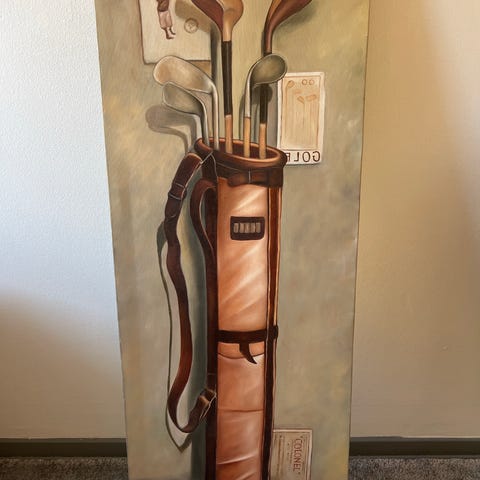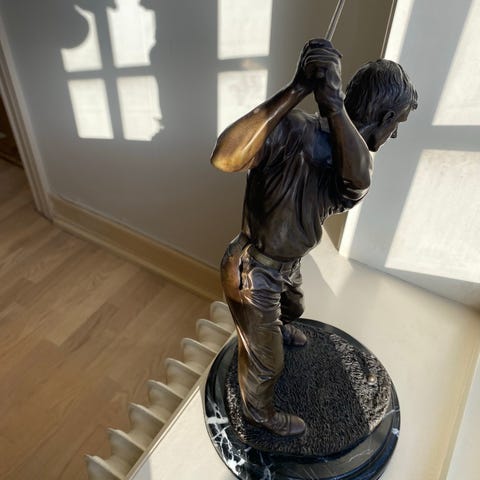 Golf samling bestående af et vægdisplay og fritstående figurer. Vægdisplayet er indrammet i træ. Derudover medfølger flere fritstående figurer af golfspillere i forskellige positioner, placeret på små sokler.