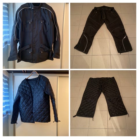 Motorcykel jakke og bukser sæt i sort. Sættet består af en langærmet jakke med høj krave, frontlukning med lynlås og trykknapper samt flere udvendige lommer. Bukserne har lynlås ved benene og justerbare stropper for bedre pasform. Begge dele har synlige reflekselementer for øget synlighed i trafikken og er velegnede som køredragt til motorcykelkørsel.