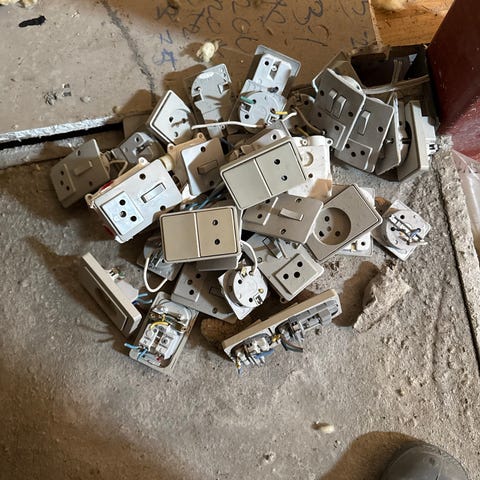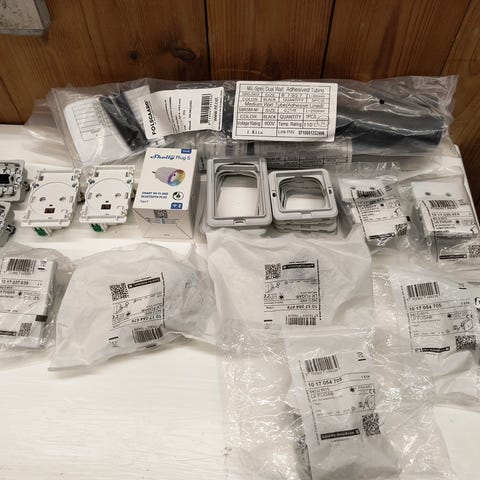 Det er hvad der blev tilovers efter montering af nye rammer og afbrydere. Sæt med forskellige stikkontakter og afbryderrammer i hvid plast. Indeholder blandt andet enkelte og dobbelte stikkontakter, afbryderindsatser, dæksler og monteringsrammer samt en rund loft- eller vægdåse. Delene er beregnet til indendørs elinstallationer, f.eks. udskiftning eller udbygning af eksisterende kontakter og stikkontakter i boligen. Farve og design er ensartet, så delene kan kombineres i samme installation.
