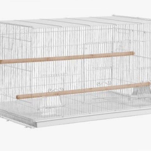 Fuglebur med tag i hvidt metal. Buret har højt design med spidst tag og bundbakke, som kan tages ud for lettere rengøring. Egnet til mindre fugle som f.eks. undulater eller kanariefugle.