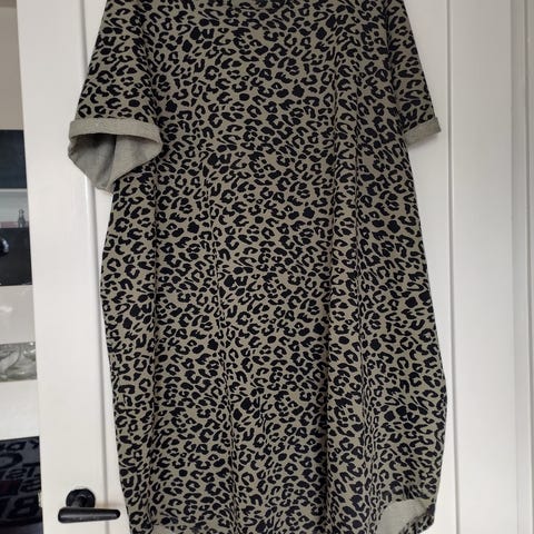 Janina hverdagskjole i str. 38. Kjolen er fremstillet i 100 % viskose og har et multifarvet leopardmønster. Ærmeløs model med rund hals og elastik i taljen. Velegnet som hverdagskjole til kvinder.