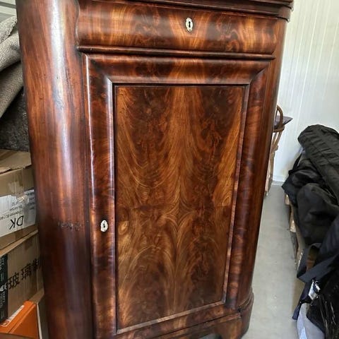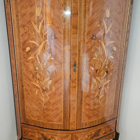 Hjørnebarskab i palisander fra 1960erne med klaplåge og spejlindretning. Øverste del har en nedklappelig låge, der åbner til et rum med hylder og spejl på bagvæggen. Nederst er der åben hylde og tre skuffer til opbevaring.
